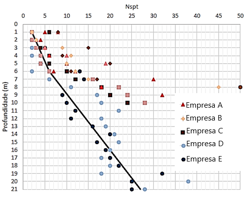 O gráfico abaixo apresenta os resultados de 5 empresas na região de Goiânia – GO para uma mesma região amostrada. A contraprova foi essencial para a tomada de decisão, pois proporcionou um projeto geotécnico mais seguro. Em suma, é extremamente importante realizar ao mínimo uma contraprova da sondagem, principalmente quando não há laudos de calibração dos equipamentos.